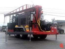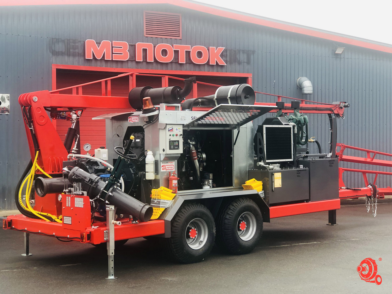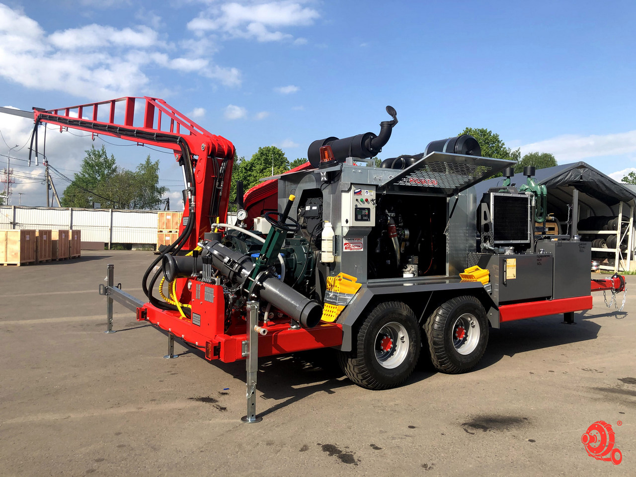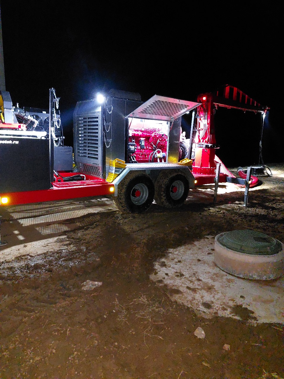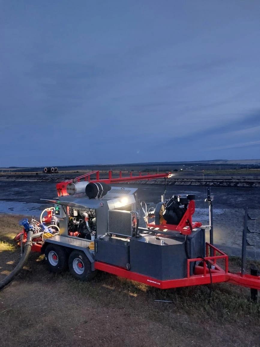 Дизельная насосная станция с погружным насосом, краном и погодозащитным капотом на двухосном шасси с шлангодержателями